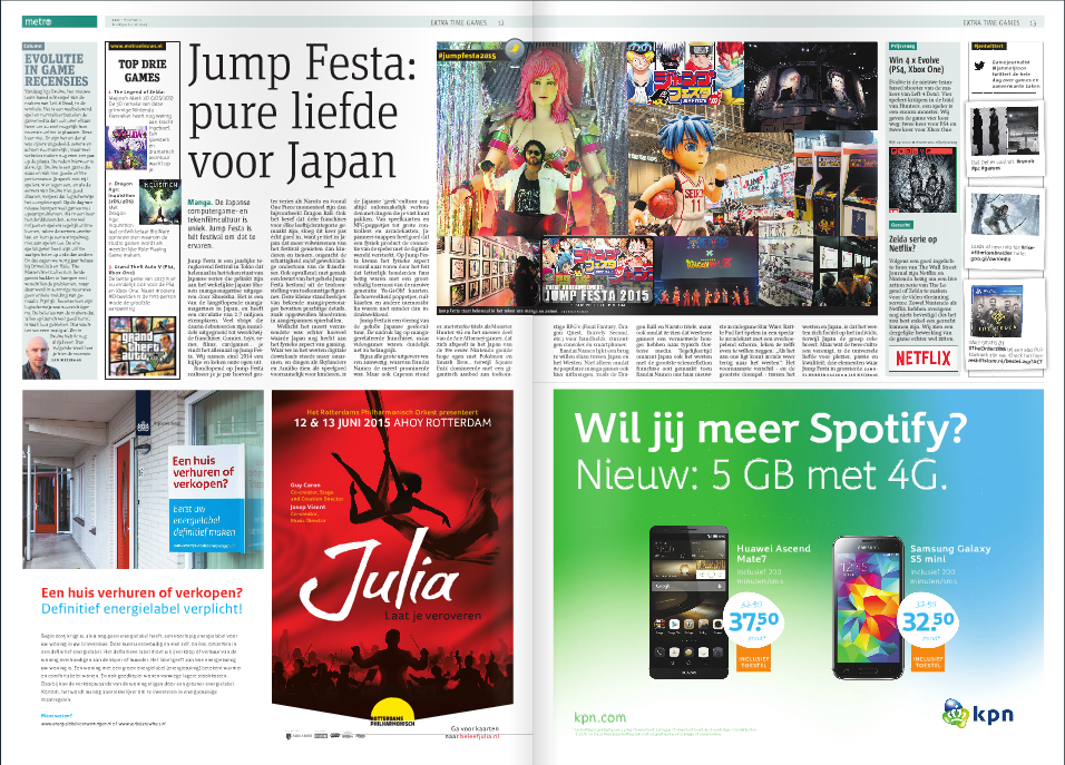 Bandai Namco recently invited press over to attend the “Jump Festa” event in Japan. Metro published a full page article on the event this week! Metro says that Bandai Namco Games was the most prominent publisher at the Jump Festa. “Bandai Namco seems to want to bridge the gap between Japan and the West. Not only because they release games of popular manga in Europe, like Dragon Ball and Naruto, but also because they see that the Western gamers have a renewed hunger for typical Eastern media.” Metro is a free daily tabloid published by Metro Holland. Metro appears from Monday to Friday, with a circulation of 510,000 copies. METRO reaches out to a daily average audience of 1.3 million readers and it’s the second biggest daily newspaper in the Netherlands. Metro is distributed free railway stations, subway stations, post offices, district offices, libraries, Q-Park car parks, universities and schools. Metro is published in 71 international editions, 19 countries and 18 languages in Europe, North and South America and Asia.